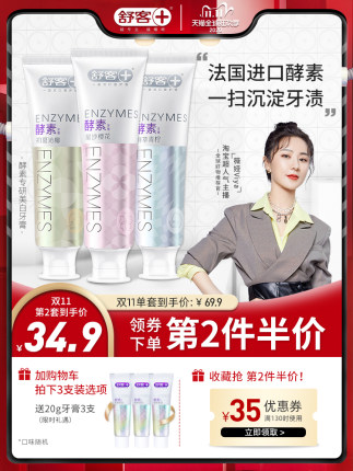 【前1小时购买3支装SKU,加送6支旅行牙膏!前10名付款额外送价值1142的SK2一瓶!1时后加送3支旅行牙膏】舒客专研美白酵素牙膏,三重净白科技,健齿护龈,修复口腔受损组织,冷热酸甜想吃就吃【赠运费