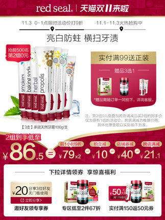 3支任选,折合¥9.9/支,比平时3支¥39的价格便宜不少,囤货好价,新西兰原装进口,新西兰牙膏销量No.1,缓解牙龈上火,改善牙龈出血,天然亮白护齿。目前天猫商城国际redseal海外旗舰店3支装售价¥89,下单立减10元,还可使用¥50优惠券,双重优惠实付¥29包邮