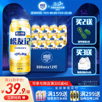 崂山啤酒旗舰店, 11月1-3日双11抢先购 ¥39.9元 抢先价, -10元优惠券, =29.9元 到手价