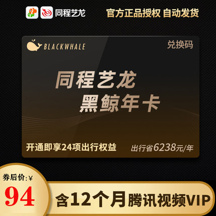 【同程艺龙 黑鲸会员 年卡+腾讯视频 VIP会员年卡12个月 94元秒充】