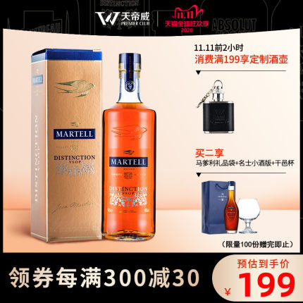 马爹利(Martell)是产自法国干邑地区的著名干邑白兰地品牌,也是世界上最古老、最驰名的白兰地酒。目前天帝威酒类专营店售价¥239,可领取¥40优惠券,实付¥199包邮到手,单瓶好价,喜欢白兰地的可以入手试味。