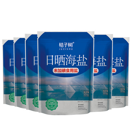 桔子树 海盐日晒无碘食用盐 320g*6袋 ,精选澳洲天然海盐,品质日晒海晶盐,不加碘不加抗结剂,自然醇净,色泽透亮,细匀洁白,美食好搭档更健康!天猫有商家领券拍下9.9元包邮