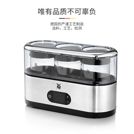 始创于1853年的WMF是来自德国的厨具品牌,在德国具有较高的知名度。这款WMF福腾宝yogert maker 酸奶机机身为WMF注册不锈钢材质,坚固耐用,常用常新,食品级塑料杯身,不含BPA,可用水冲洗;15瓦的低耗能有着不俗的表现,自带有过热保护、自动断电和断电声音提示功能,LC显示屏,可随时查看发酵温度;3个杯子,可制作不同口味酸奶,150ml的便携式容量,搭配有旋紧式防漏杯盖;制作牛奶时,将纯牛奶或鲜奶加入发酵剂,盖好盖子接通电源,调整发酵时间即可。