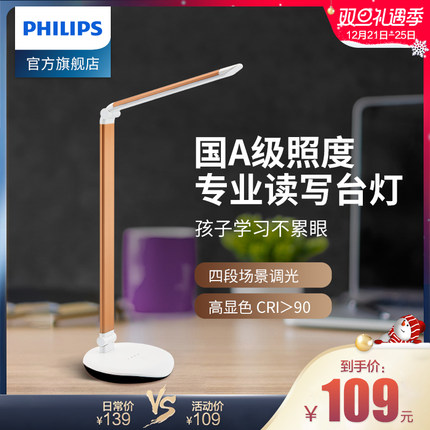 飞利浦照明官方旗舰店139元,下单立减30元,可领10元优惠券,实付99元到手,这款飞利浦led护眼台灯,折叠式结构,造型上比较简约,用铝合金材质制成,质感强颜值高,可180度旋转灯头,可作为宿舍的书桌灯或者床头灯使用。