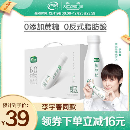 伊利旗舰店55元,下单立减6元,可领10元优惠券,实付39元到手;伊利新品植选 原浆豆乳,每100g含6.0g优质植物蛋白营养,含量是国家标准最低要求的2倍多,优选黑土地种植的优质非转基因大豆,低温隔氧研磨+高温侵入式杀菌,深度萃取植物营养,造就顺滑醇厚口感,无蔗糖添加,0反式脂肪、0胆固醇、0香精,健康美味,值得品尝。