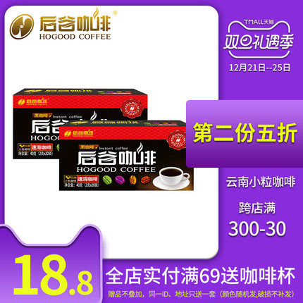 后谷旗舰店售价¥18.8, 满2件7.5折,可使用店铺¥5优惠券,拍2件,实付¥23.2包邮,到手80袋,选用云南小粒咖啡豆,入口香醇,口感顺滑,甄选原料,精心烘焙,严控曲线,健康尽享醇香美味。