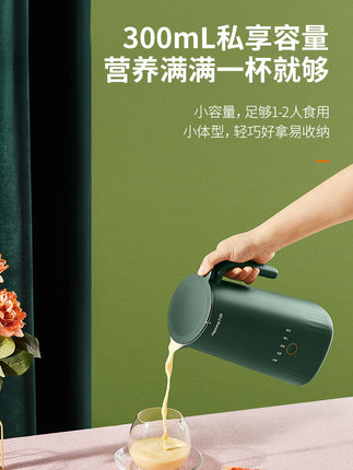 =169元 到手价,无需泡豆 自动熬煮 破壁免滤。赠运费险+正品保证,家用全自动智能豆浆机,5大功能菜单:豆浆,米糊,奶茶,果汁,烧水,300ml容量体积小巧,适合1-2人饮用,不会造成打多了喝不完浪费的情况,无需泡豆可直接打,破壁免滤直接喝,口感倍浓,立体加热,快速制浆,细腻无渣免过滤,支持智能预约,还防糊防溢。