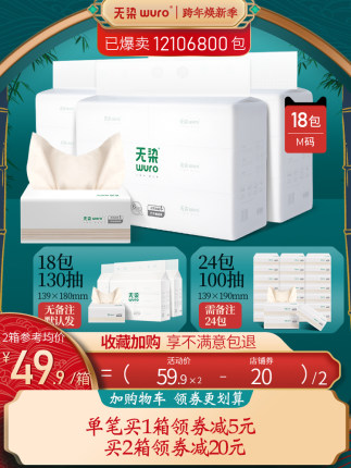 这款抽纸无漂白,无有害添加,抽纸可直接接触食品,内部添加天然提取的竹锟精华,抑菌率高达99%,具有多孔纤维,可以瞬间吸收和蒸发水分,湿水后韧性更强,擦拭后不易松散,干湿两用,卸妆洗脸均可。无染旗舰店59.9元,可领20元优惠券,实付39.9元到手