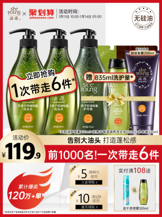 天猫滋源旗舰店119.9元,可领10元优惠券,实付109.9元到手,规格是洗发水400ml*2瓶,还送护发素400ml+235ml补充装+发膜200ml+洗发水200ml,非常划算。滋源是港环亚集团旗下无硅油洗护品牌。其中洗头水采用无硅配方,洗后较为清爽。但是又添加了无患子、覆盆子和芦荟等植物提取物,含有的多种维生素能够同时滋养头皮和头发,洗后依然不算干涩,气味清甜,配合同系列护发素使用更佳。无矿物质、无染色剂、无动物性原料、无尼泊金脂、无石油类表面活性剂,可有效控制头皮油脂,润养发丝、洁净修护、抚平毛躁、轻盈蓬松。