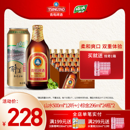 【青岛啤酒 高端金质瓶 小棕金296ml*24瓶+山水 500ml*12听 券后119.9元包邮】