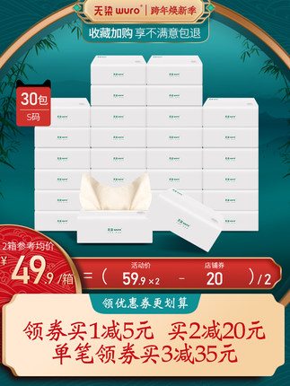这款抽纸无漂白,无有害添加,抽纸可直接接触食品,内部添加天然提取的竹锟精华,抑菌率高达99%,具有多孔纤维,可以瞬间吸收和蒸发水分,湿水后韧性更强,擦拭后不易松散,干湿两用,大小适中。无染旗舰店59.9元,可领15元优惠券,实付44.9元到手 。规格:30包。