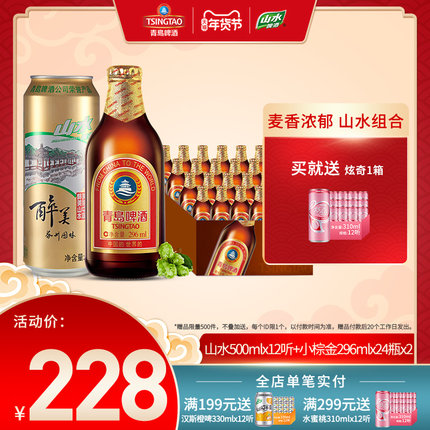 【青岛啤酒 11度高端金质小瓶 296ml*24瓶*2箱+山水500ml*12听 208元包邮 赠炫奇鸡尾酒1箱】