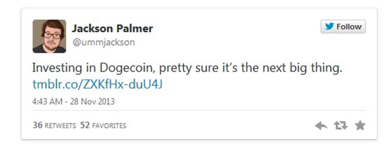 这时,身在Adobe悉尼市场部的营销专员杰克逊帕尔默萌生了一个恶搞的想法:他决定把以狗头表情包来做一款数字货币,用以讽刺当时数字货币圈高涨的投机氛围。接着,他在Twitter上发了一条推文写道:
