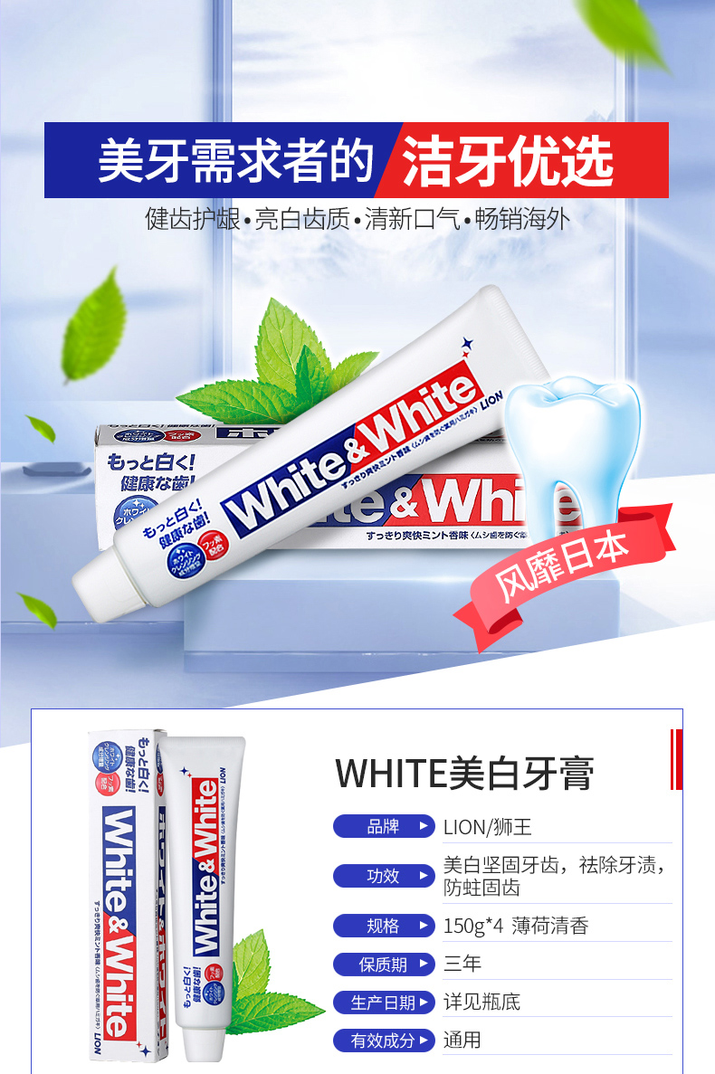 5.0¥0a02XV08cjp¥ https://m.tb.cn/h.4skPicR LION狮王 WHITE美白牙膏 亮白牙齿去黄 口气清新 150g*4日本进口