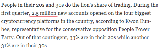 也就是说有十分之一的韩国人炒币,而且去掉孩子和老人的话,三个韩国青壮年中,就有一个炒币。