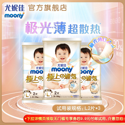 【Moony 尤妮佳 极上通气系列 极光薄腰贴型纸尿裤 试用装 L2*3 9.9元包邮】