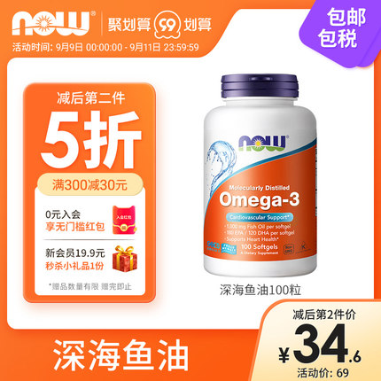美国原装进口,总统授奖品牌:100粒x2瓶 NOW 深海鱼油软胶囊 拍2件83.5元包邮