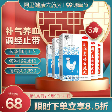 阿里健康大药房 同仁堂 乌鸡白凤丸 300粒/36g*5盒 补肝肾正阳虚 47.66元9日0点抢 直降10元 限前1小时立减