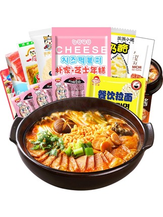 超级划算的部队火锅套餐,包括泡菜150g+火锅酱+年糕条200g+餐饮面+鱼饼200g+小烤肠3袋!在家吃上一顿火锅太美味了~