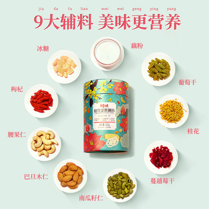 坚果加藕粉的神奇混合,坚果含量大于百分之36.5,有口感有营养,满满桂花香气,一口酥脆,一口酸甜,爱吃甜品的小仙女别错过啦~目前天猫商城百草味冲饮旗舰店2罐售价¥119.8(也可选1罐装拍2件),下单立减¥59.9,还可叠加¥5优惠券,双重优惠实付¥54.9包邮。