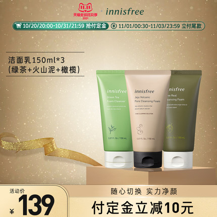 天猫innisfree官方旗舰店, ¥139元 预售价, -10元 付定金立减, -64元优惠券, =65元 到手价(定金20+尾款45),规格是150ml*3支,分别是火山岩泥+绿茶洁面+橄榄油泡沫。