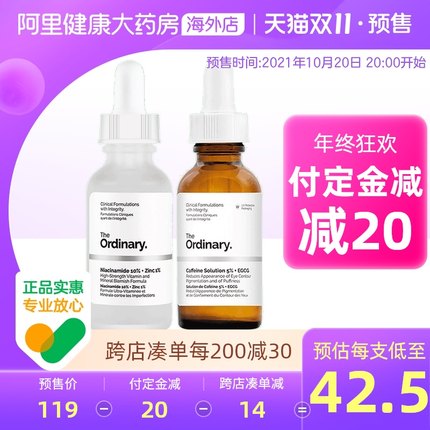 提亮肤色,改善暗沉,消除浮肿,减少眼部轮廓色素沉积。天猫精选该商品预售价119元,支付定金20元,1日付尾款立减20元,参加每满200元减30元满减,领取满11元减10元优惠券,下单3件,到手实付257元,折合85.66元/件,喜欢可入。The Ordinary 10%烟酰胺+1%锌 美白精华 30ml比较适合油性肌肤,痘痘肌,针对肌肤过度出油和毛孔堵塞,因为烟酰胺成分较高,所以肌肤不耐受的要谨慎使用,脸颊比较敏感的话,也可以使用在T区,可有效改善肌肤瑕疵和毛孔粗大,平衡油脂分泌,减少面部油光,使皮肤细腻光滑。The Ordinary 5%咖啡因+EGCG 眼部精华含有5%的极高浓度咖啡因,辅以绿茶抗氧化剂(EGCG)。独立研究表明,使用咖啡因和EGCG的任一种可以帮助减少眼部轮廓浮肿和黑眼圈。另外的研究表明,咖啡因也可减少橘皮组织的出现。 因为EGCG对光较敏感,特提供紫外线防护包装。