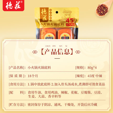 精心甄选,上乘品质,正宗牛油老火锅料,手工全型料,有滋有味。目前天猫商城德庄旗舰店3袋装售价¥59.9,参加1件9折活动,可使用¥8优惠券,实付¥45.91包邮,折合¥15.3元/袋,根据德庄门店配方精心炒制,香气浓郁,麻辣。