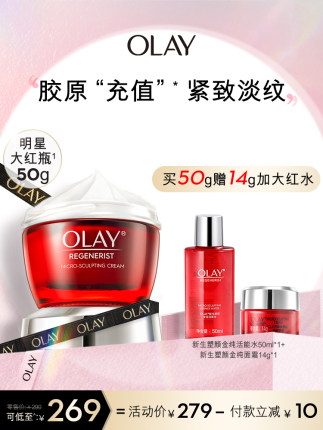 天猫olay官方旗舰店279元,下单立减10元,可领10元优惠券,实付259元到手,规格是50g,赠新生塑颜金纯活能水 50ml+新生塑颜金纯面霜14g。补水,保湿,滋润,紧致,抗皱,淡化细纹。