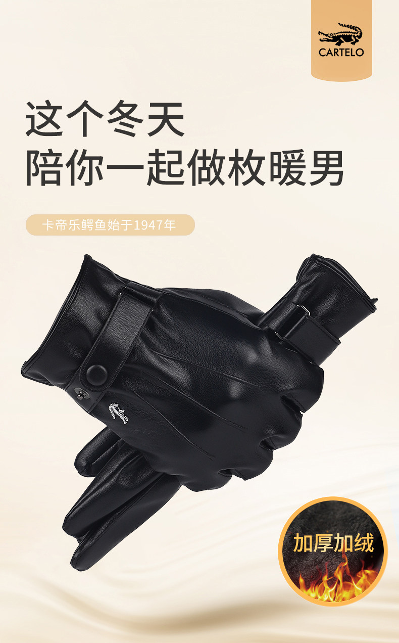 卡帝乐鳄鱼 情侣款加绒加厚保暖防水触屏手套,Pu材质,内里加绒,具备很好的透气性;立体裁剪成型配合工整的内部缝合工艺,让手套更有形体感更美观服帖;全掌自带可触屏性能,灵敏度高,既能御寒保护双手, 又能方便轻松工作和娱乐;弹力收口束带设计,密封袖口,防止寒风倒灌。