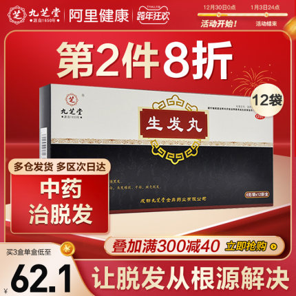源自1650年,中华老字号,中国非物质文化遗产。九芝堂 生发丸,中药治脱发,填精补血,补肝滋肾,乌须黑发。凡精血不足、肝肾亏虚所致的须发早白、头发脱落稀疏、干枯斑秃等可用。目前天猫阿里健康大药房1盒装售价69元,满2件9折,领取10元优惠券,实付114.2元包邮,折57.1元/盒,1疗程为3盒。