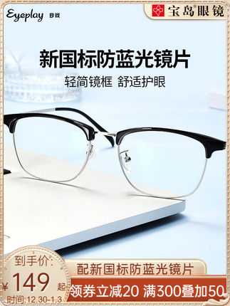 宝岛眼镜官方旗舰店, 12月30日~1月3日 天猫跨年狂欢, 平光镜款¥169元 跨年狂欢价, -120元优惠券, =49元 到手,还有1.60、1.67镜片可选。 新国标防蓝光镜片 轻至10克 可配度数。