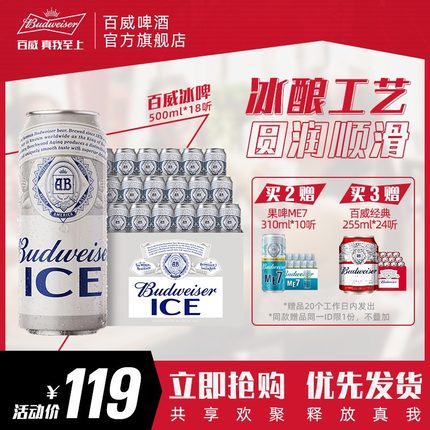百威啤酒 冰啤,新品研发,使用水、麦芽、大米、酒花浸膏、酵母运用独特的冰酿工艺酿成,经过冰晶化处理得到的啤酒清澈透亮,圆润顺滑,口味醇厚爽口,特别带劲,还有优雅的麦芽香味和独特的啤酒香气。百威啤酒官方旗舰店119.9元,可领40元优惠券,实付79.9元到手,规格是500ml*18听。