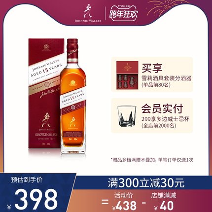 15年雪莉礼盒版,顺滑纯美,蕴含雪莉香味,热情奔放,活力四射,精选几十种种麦芽和谷物威士忌调配,大胆强劲,风味独特,目前天猫尊尼获加官方旗舰店售价¥438,可领取¥15优惠券,app端价格下可领¥300-30购物券,实付¥393包邮,高端洋酒,自饮送人都不错。