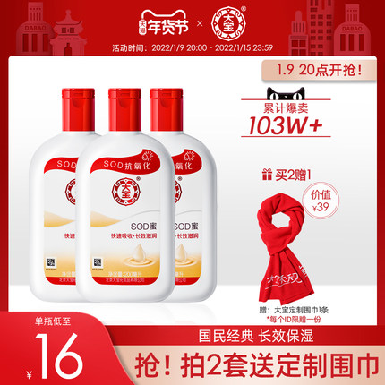 =42.9元 到手,规格是200ml*3瓶装,线下200ml的一般是25元/瓶。大宝 SOD 蜜,内含丰富的 SOD 活性物质,并加入人参、黄芪等天然植物的有效成分,它极易被皮肤吸收,并在皮肤表面形成一层保护膜,能不断地对皮肤补充 SOD 活性物,并能有效地防止角质层水分的散失。