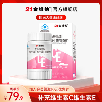 天猫21金维他旗舰店79.9元,可领60元优惠券,实付19.9元到手,规格是60片,下单还赠送30片,共90片,21金维他旗舰店,蓝帽认证,民生药业,线下药房同款!这款21金维他 维生素C+E复合维生素片,同时补充维生素C和维生素E,适合成年女性。维生素C与维生素E协同作用,共同对抗紫外线与自由基对抗肌肤各种亚健康问题,美白养颜抗衰老,增强抵抗力,提升免疫力。