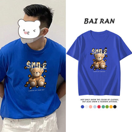 男女同款纯色短袖宽松蓝色内搭,满印小熊,点缀刺绣。