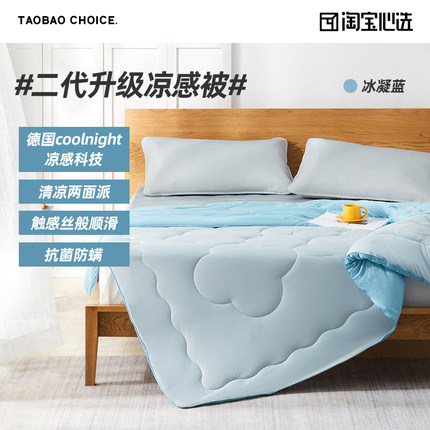 淘宝心选夏凉被,采用德国进口的coolnight凉感科技纤维面料,能够快速带走体表热量,在热交换的过程中带来冰凉体感。纤维中还融入了艾草精华,纯物理技术保留淡淡草本植物清香,具有安神睡眠,驱蚊防虫,抗菌等功效。双A纺织物通过JTC专业性标准检测,无荧光、无异味、不掉色。AB双面设计,灰面驱蚊凉感、蓝面柔软舒适,精美包边经久耐用,可水易打理。