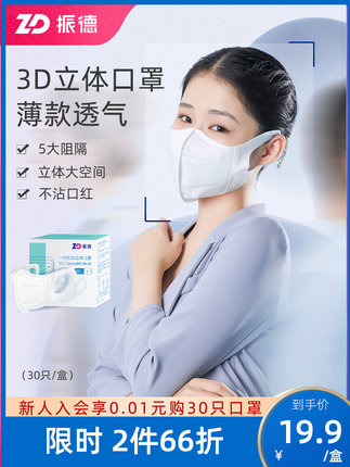 3D立体防护,修饰脸型,不易花妆,执行GB/T 32610标准,3层过滤,含熔喷布。天猫zd振德旗舰店30只售价¥29.9,下单2件66折,可领¥10元优惠券,实付¥29.47包邮。