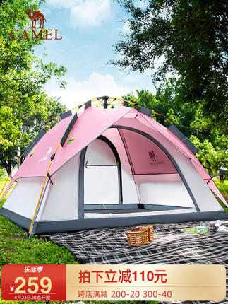 骆驼服饰旗舰店, 4月23日20点~4月26日 天猫乐活季, ¥369元 乐活季价, -100元优惠券, -20元 (每满200减20元)跨店满减, =249元 到手价, 两面网纱 晴雨通用 防雨防晒 4-5人大空间。