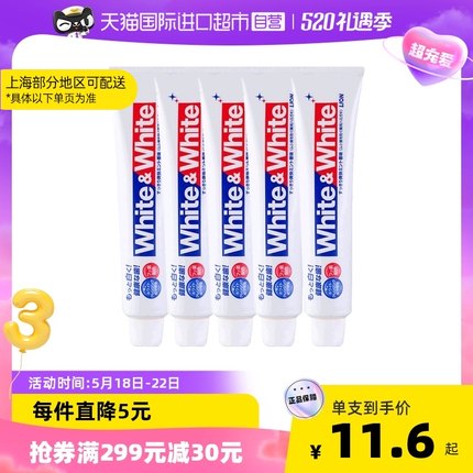 这款狮王 美白牙膏,日本原装进口,泡沫丰富,有美白坚固牙齿,祛除牙渍,防蛀固齿的功效,清爽薄荷香气,清新口气无异味;天猫国际进口超市售价63元,下单立减5元,可领15元优惠券,实付43元包邮到手,规格是150g*5支