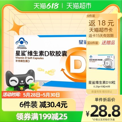 领25元券,叠加10元券,5元福袋,返9元猫卡!单件到手16.4元,买3盒赠12粒钙(赠完即止)。星鲨维生素D3软胶囊30粒*6盒VD适用于1岁以上幼儿童孕妇补维d,春季就是补维d的时候赶紧屯起来!