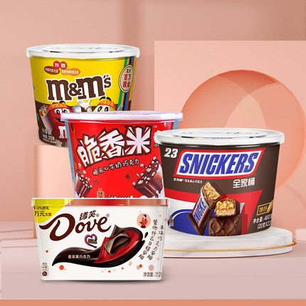 mms豆桶装,士力架,脆香米,黑巧克力任意搭配!香浓可口,入口柔滑,一次尽享。目前4桶装天猫商城德芙官方旗舰店售价¥1496.,可使用¥67优惠券,实付¥79.9包邮,多款组合可选。