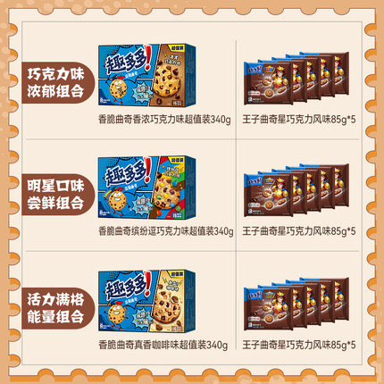 两个组合可选,包含:巧克力/咖啡香脆曲奇+王子曲奇星5包,香脆曲奇配上浓郁巧克力豆,很经典的小饼干,搭配浓茶或者咖啡当下午茶吃正好