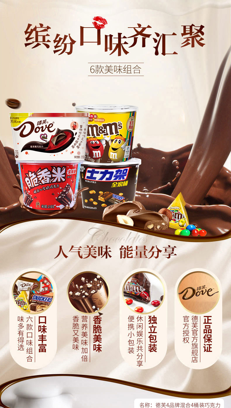 Dove德芙是美国玛氏(Mars)旗下知名巧克力品牌,据说其英文商标Dove是“DO YOU LOVE ME(你爱我吗?)”的缩写,为原本普通的巧克力增加了浓郁的感情色彩。自1989年进入中国以来,德芙已经成为中国巧克力的领导品牌。在众多巧克力品牌中,德芙应该是亲民价位里口味最好的,柔滑口感可谓是深受喜爱。