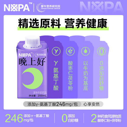 蒙牛 莫帕 NOPA 晚上好原味睡眠牛奶 200mL*10瓶,选用优质奶源,添加γ-氨基丁酸,药食同源添加酸枣仁粉+茯苓粉,放松心情,抵抗焦虑,营养健康,助力好睡眠。目前天猫商城特价148.9元,叠加119元优惠券,实付29.9元包邮。