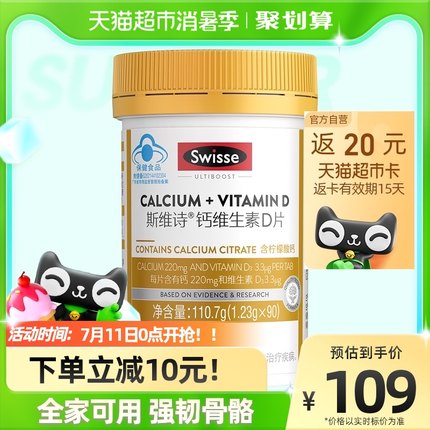 中国蓝帽子证书,全新升级,斯维诗钙维生素D片,含柠檬酸钙,温和易吸收,小颗粒,方便吞服。每片含有钙220mg和维生素D3 3.3μg,综合配方助力补钙。目前天猫超市聚划算价¥ 119,下单立减¥10,领取¥45优惠券,叠加手机端领取88-5元购物券,实付¥59包邮,下单返20元猫超卡,到手即¥39,88会员还可额外95折,随餐服用,高效补钙好吸收