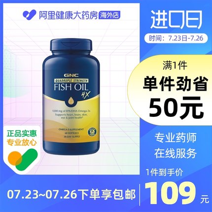 高纯度五星鱼油,GNC 健安喜 Omega-3四倍冠军鱼油 60粒98.8元包邮