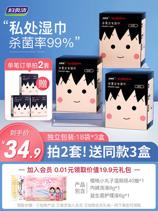樱桃小丸子联名款,经期专用湿巾,弱酸平衡,擦除细菌99%,温和0刺激,独立小包,随身携带。目前妇炎洁官方旗舰店18片*3盒售价¥34.9,可使用¥15优惠券,实付¥19.9包邮,到手54片,官方旗舰店出品。妇炎洁 本草卫生湿巾18片*3盒,棉柔亲肤无纺布材质,质地柔韧,水份足;萃取多种植物草本精华,抑菌去味不刺激;科学配比,私处专用,不添加有害成分,孕妇也可使用;独立包便携,出差旅行,温泉游泳,大姨妈期,房事前后,擦擦更洁净。