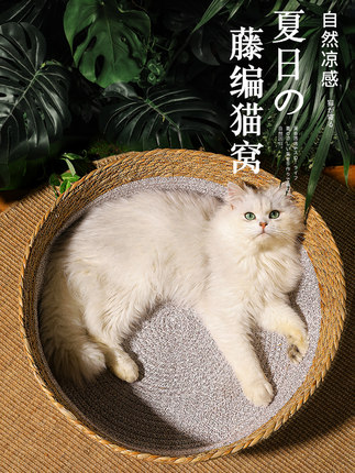 适合夏天的藤编猫窝,清凉草编,透气降暑,可搭配棉垫&毛毯,四季皆可使用。一个可以磨爪的窝,结实耐咬,健康无甲醛。