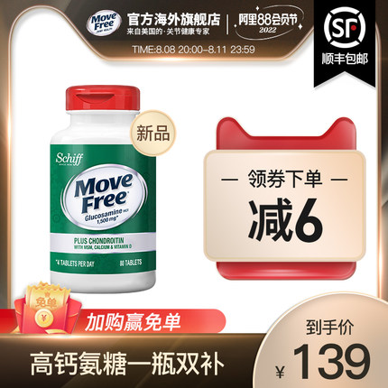 高含量氨糖+钙,1瓶双补 ,钙修护关节,强健骨骼,一瓶双效。目前天猫国际MoveFree官方海外旗舰店售价¥159,下单即为2件,领取¥318-100优惠券,到手实付¥218包邮包税,折合¥109元/件,一天4粒,一瓶可服用20天,适合中老年人关节保养,送给家中老人正合适。